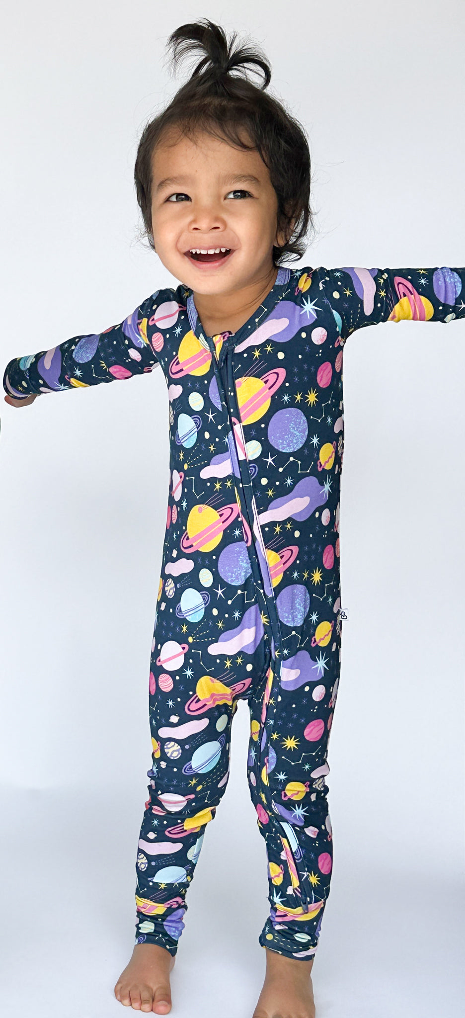 We absolutely love the bright colors in this exciting spaced out print, which is perfect for both boys and girls.